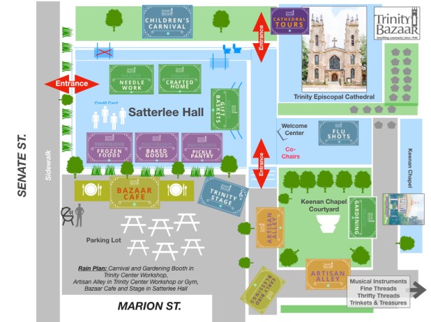 Bazaar Map – Satterlee Hall, Children’s Carnival,  Bazaar Cafe, Trinity Stage, Gardening Booth, Artisan Alley